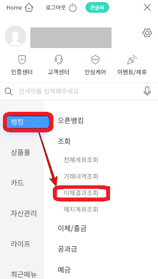 - 메뉴에서 뱅킹을 선택 후 하위 메뉴 이체 결과 조회 목록으로 이동합니다.