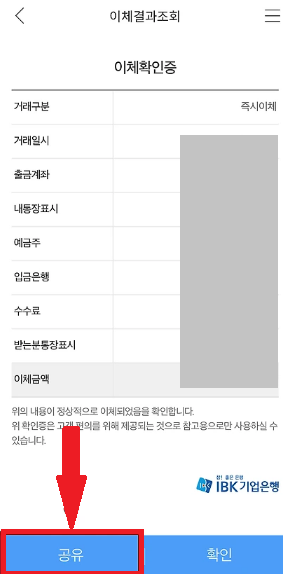 - 원하는 이체확인증 조회 후 하단에 공유를 눌러줍니다.