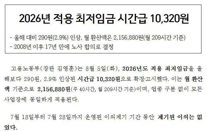 그리고 2026년 최저임금도 공식적으로 발표가 되었습니다.